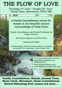 A women’s Family Constellations and Rituals retreat exploring the flow of love and life from our ancestors, in the beautiful natural surroundings of Trealy Farm retreat centre in South Wales only an hour from Bristol, UK